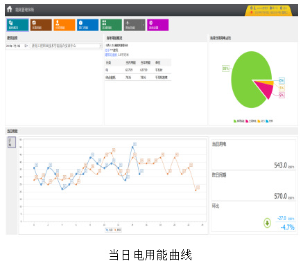 通過表計計量的主要為電能消耗,界面下方顯示電能的當日逐時用能曲線;單擊每個分類能耗的上部區域,可跳轉到該分類能耗的用能分析主界面;