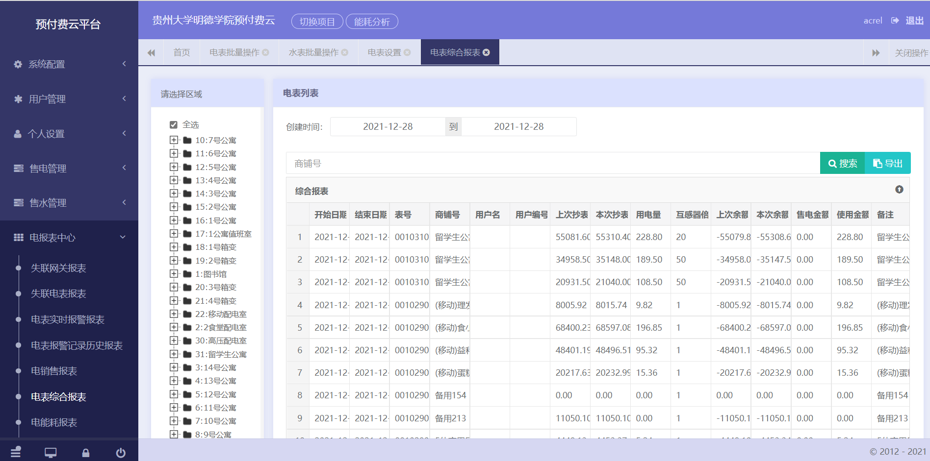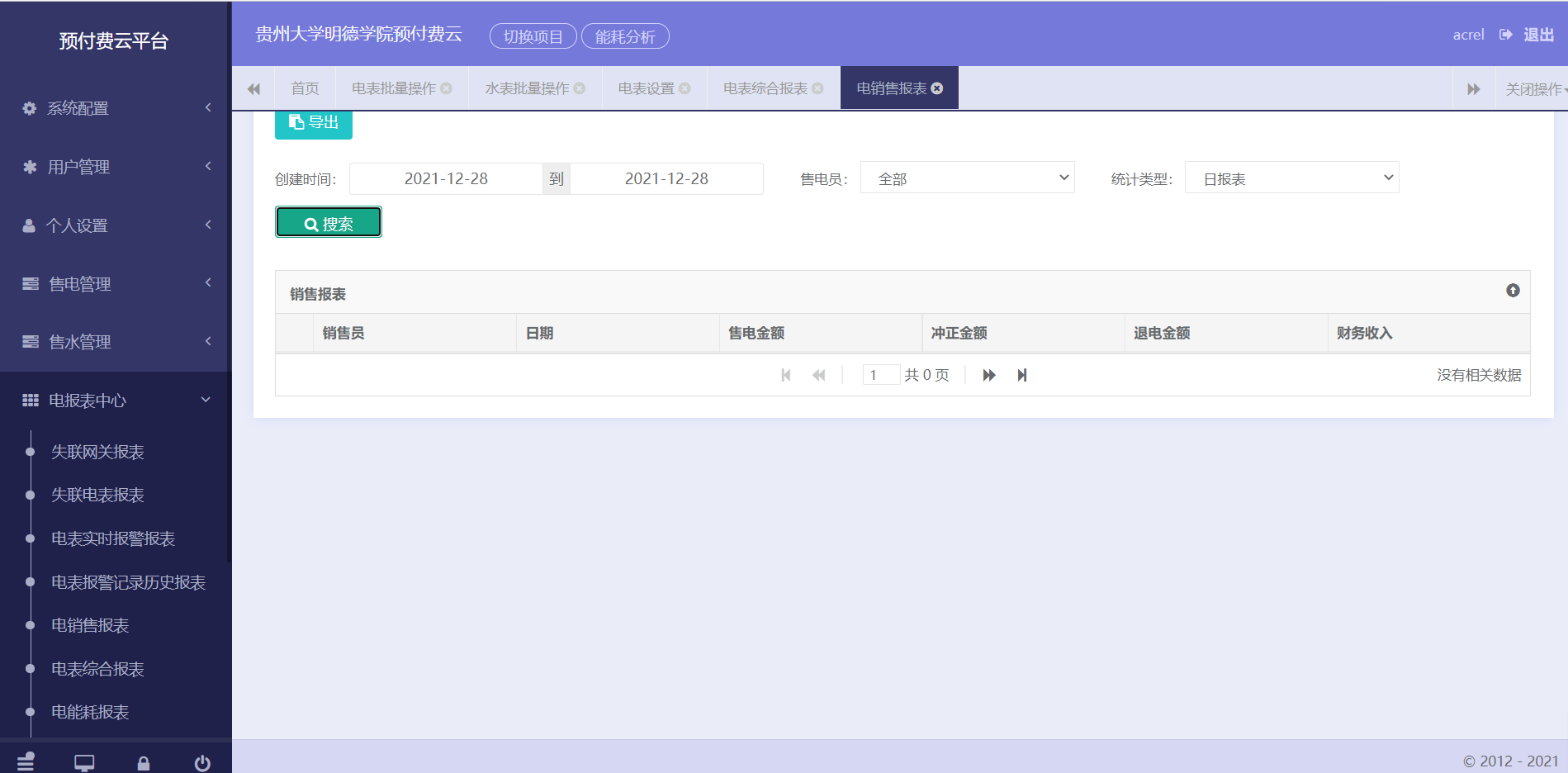 系統還提供了多個報表以供查詢,分別是日/月/年財務銷售統計報表、失聯表/通訊管理機查詢報表、能耗查詢報表、實時報警/歷史報警查詢報表,支持導出。以下是財務報表和預付費表日用能查詢報表: