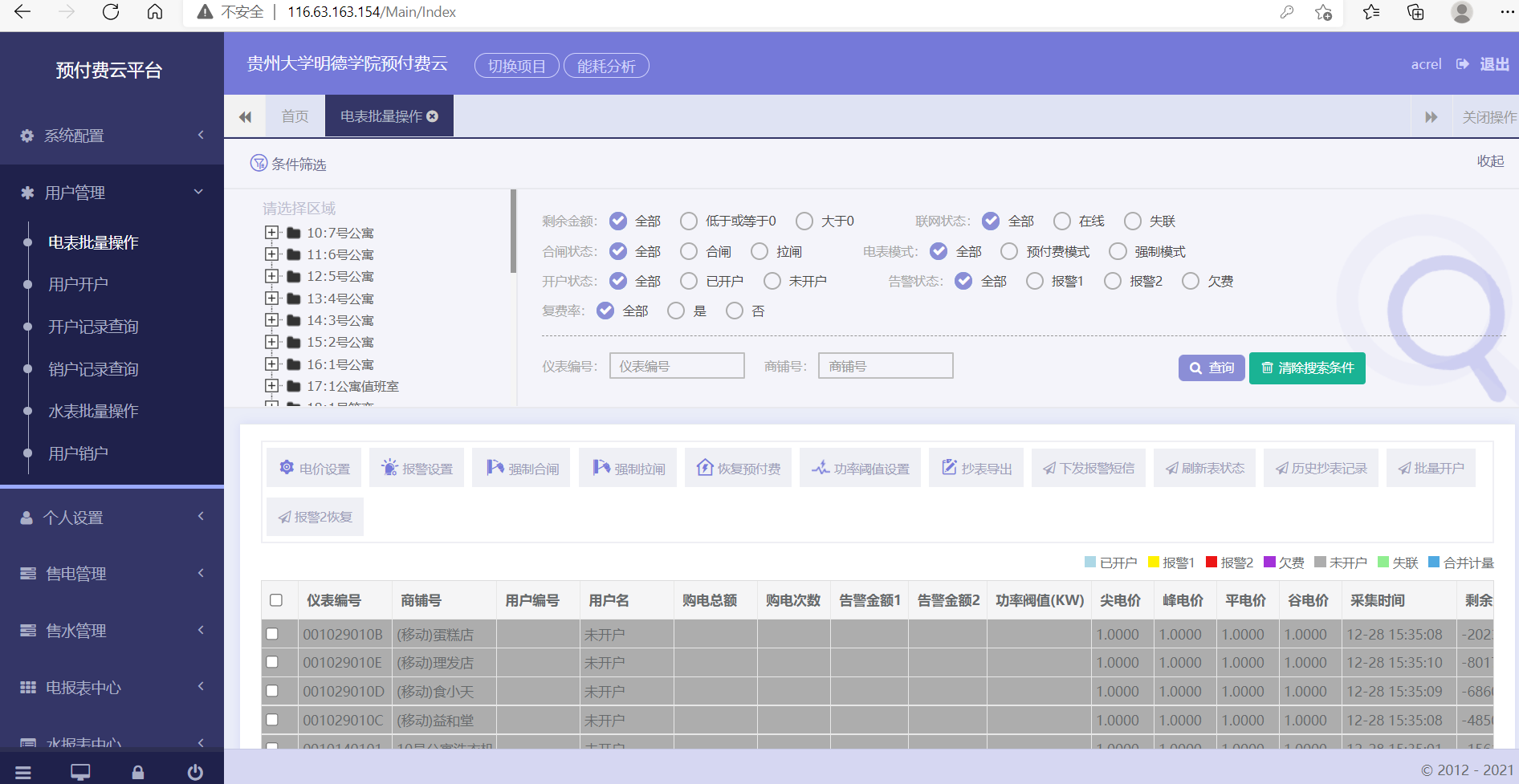 c)用戶管理:對商鋪用戶執行開戶、銷戶、遠程分合閘、抄表導出及記錄查詢等操作;