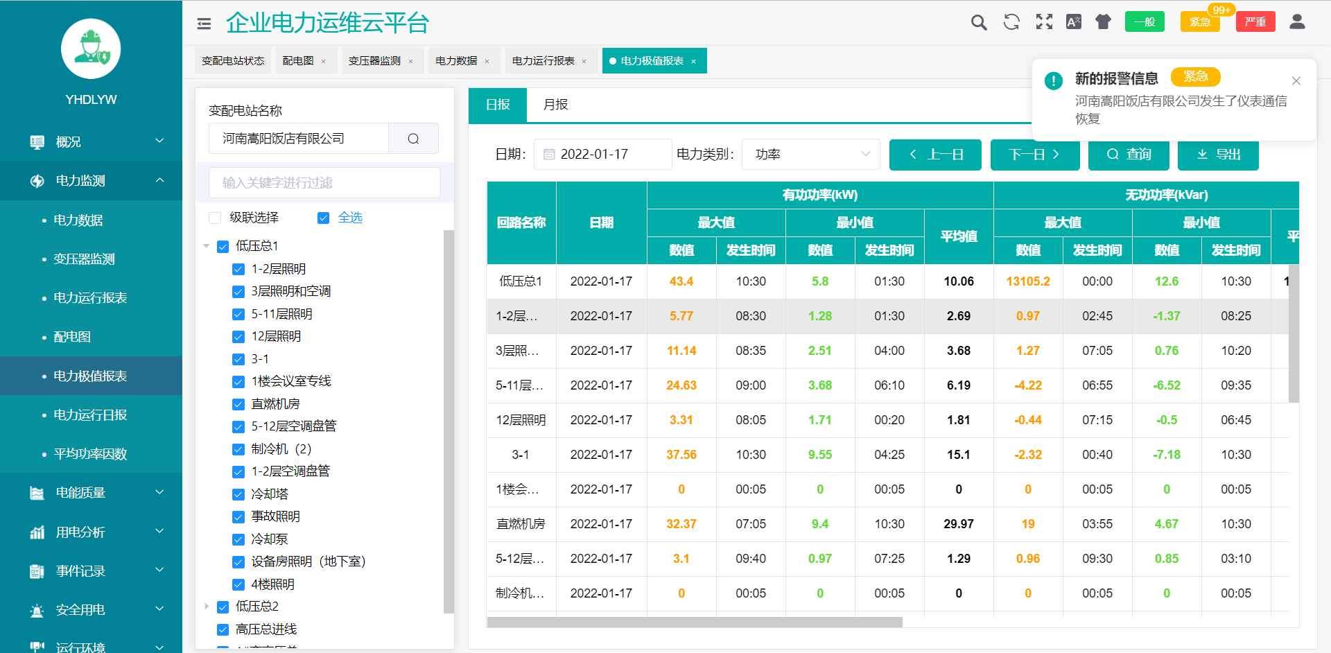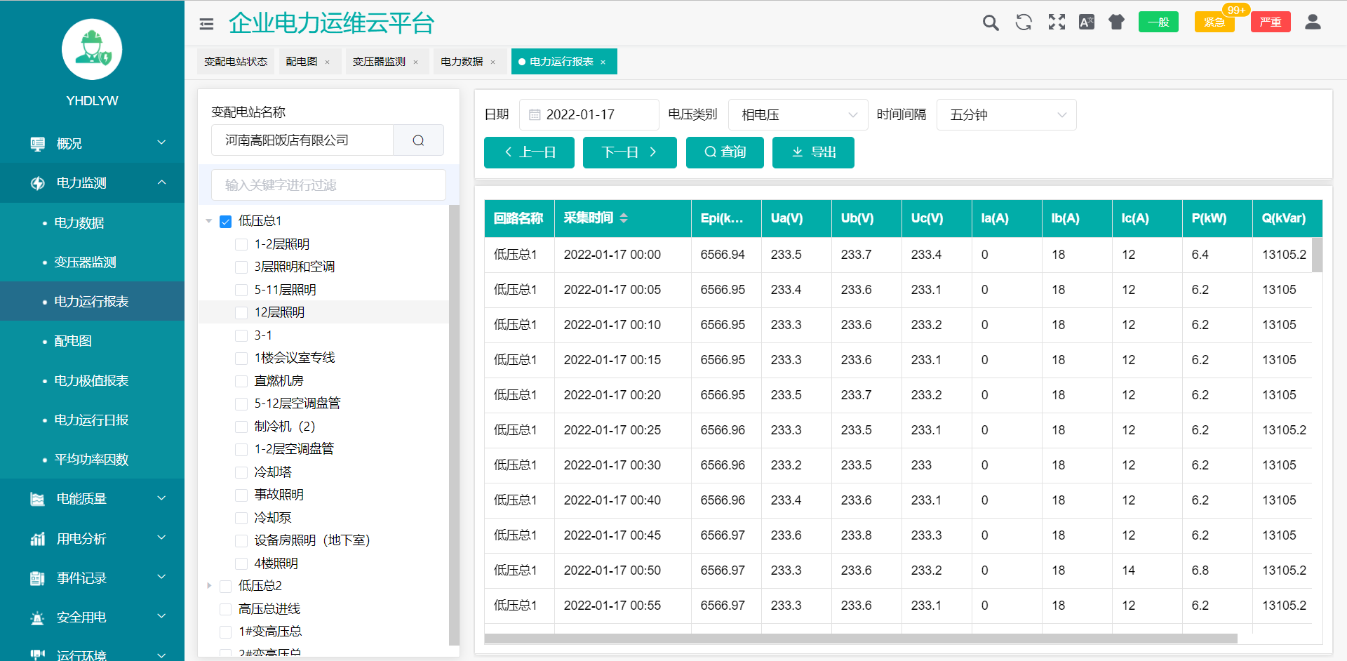 電力數據顯示變電所各回路的電力數據和曲線,包括電流、相電壓、線電壓、頻率、功率因數、有功功率、無功功率、視在功率等參數,并可導出圖表。