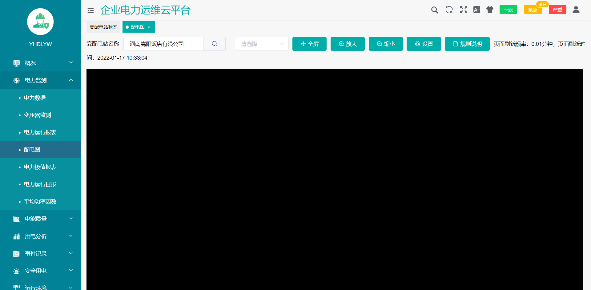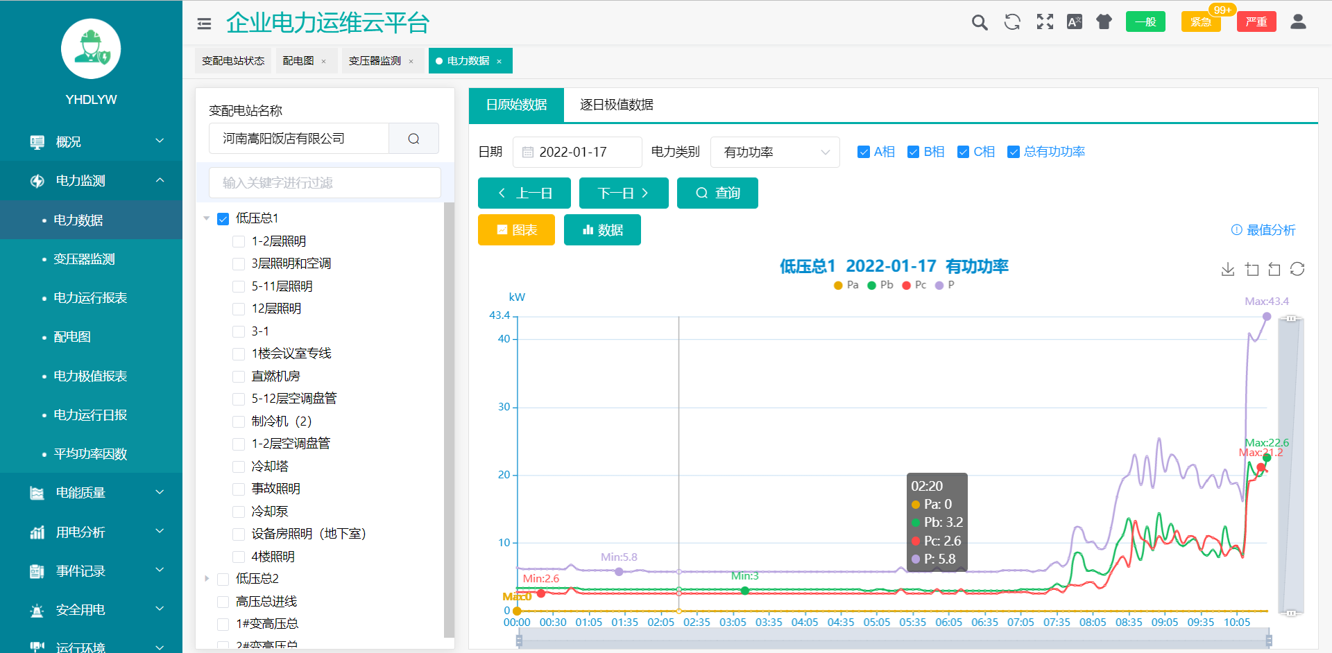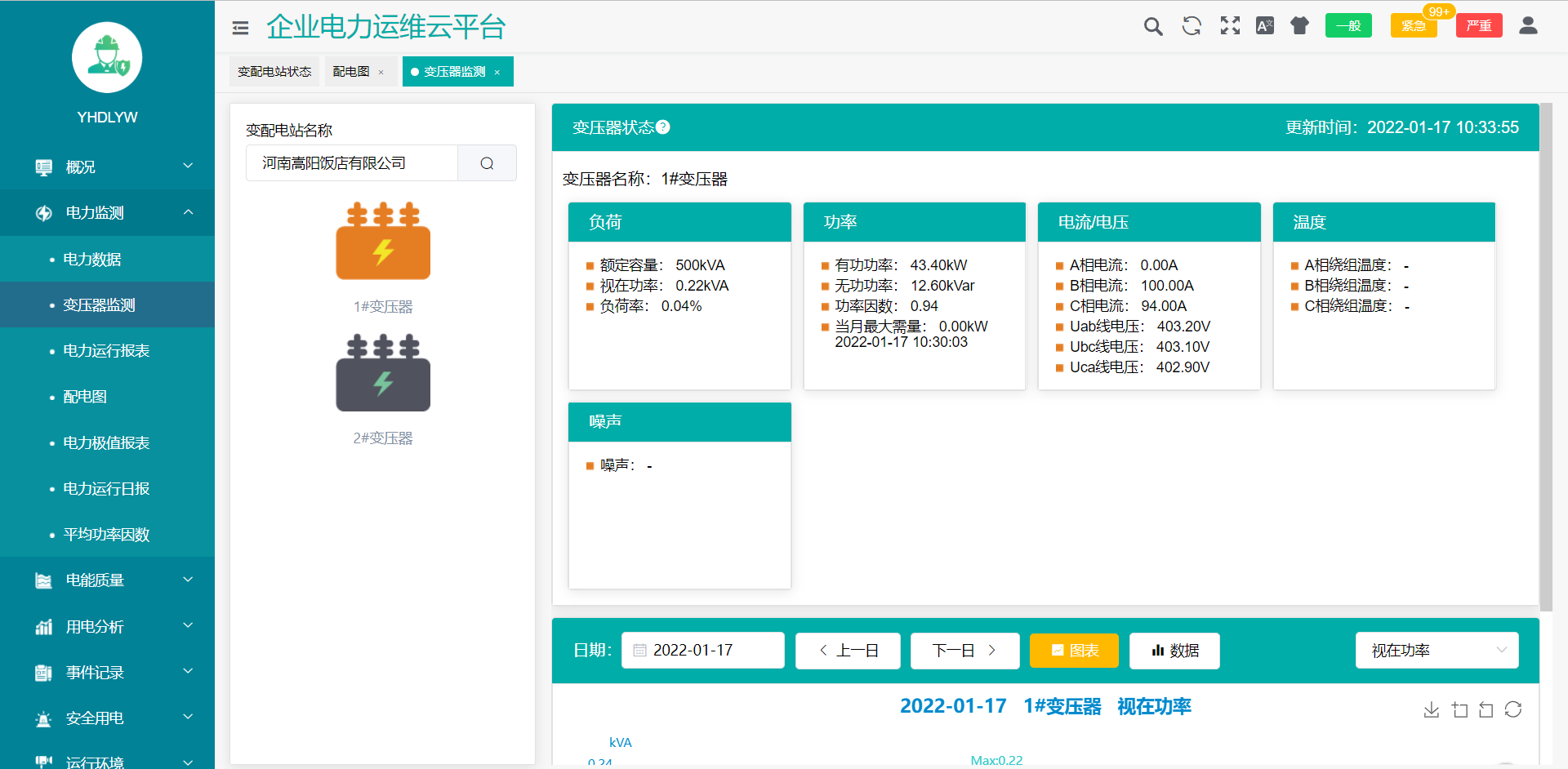 “電力監控”頁面包括配電圖、變壓器監測、電力數據。