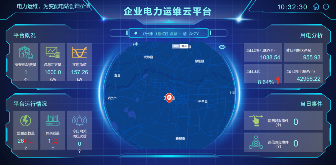 平臺首頁為變電所概況,包括變電所狀態、地圖導航和用能月報。變電所狀態包括:變電所概況、運行狀態、當日事件記錄、當日逐時用電曲線、用電概況。