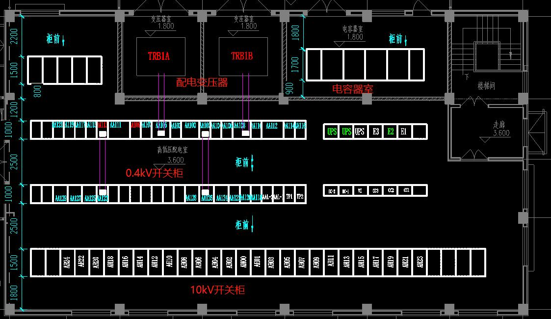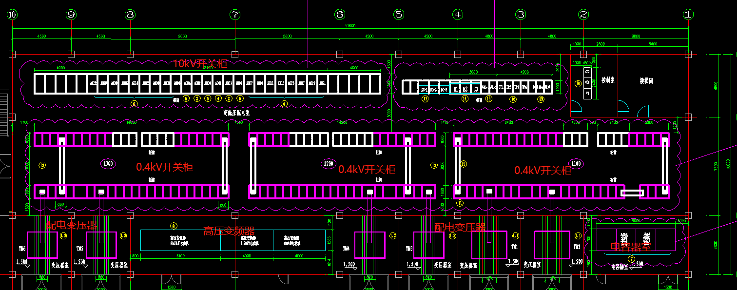 本工程為山東凱瑞英材料科技有限公司35kV供配電工程,共有35kV總變電所一個(gè),包括35kV配電系統(tǒng)和總變10kV配電系統(tǒng); 10kV循環(huán)水場(chǎng)變電所一個(gè);10kV裝置變電所一個(gè)。本工程由兩路35kV電源供電,安裝兩臺(tái)容量為16MVA的主變壓器。35kV總變電所配置8面KYN61-40.5中置式開(kāi)關(guān)柜,進(jìn)出線方式為電纜下進(jìn)下出,柜體顏色為RAL7035,斷路器選用VBG-40.5P-31.5,電流互感器選用LZZBJ9-35D1;配置25面KYN28A-12(Z)中置式開(kāi)關(guān)柜,進(jìn)出線方式為銅排上進(jìn),電纜下出,柜體顏色為RAL7035,斷路器選用VBG-E-12P-31.5,電流互感器選用LZZBJ9-10C1。循環(huán)水場(chǎng)變電所配置25面KYN28A-12(Z)中置式開(kāi)關(guān)柜,進(jìn)出線方式為電纜下進(jìn),電纜下出,柜體顏色為RAL7035,斷路器選用CZK2-12-31.5,電流互感器選用LZZBJ9-10C1。裝置變電所配置24面KYN28A-12(Z)中置式開(kāi)關(guān)柜,進(jìn)出線方式為電纜下進(jìn),電纜下出,柜體顏色為RAL7035,斷路器選用CZK2-12-31.5,電流互感器選用LZZBJ9-10C1。本工程共有一個(gè)35kV變電站和1個(gè)10kV開(kāi)閉所,2個(gè)10kV變電所,35kV市電引入后經(jīng)由35kV/10kV變壓器,降至10kV電引入開(kāi)閉所,再由開(kāi)閉所進(jìn)行分配電能至各個(gè)分變電所,整個(gè)變電站的一次系統(tǒng)干線圖以及平面布局圖如下: