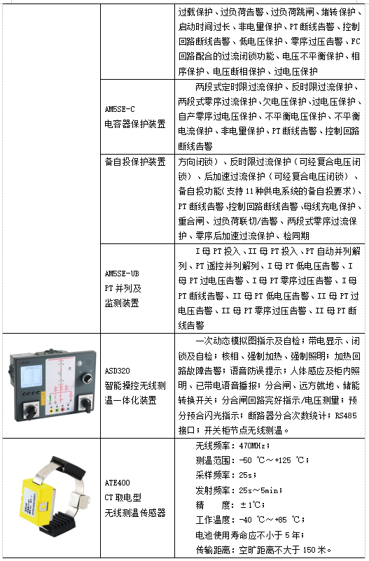 本次針對(duì)該35kV配電工程項(xiàng)目中不同保護(hù)對(duì)象配置不同微機(jī)保護(hù)裝置,35kV主變柜按主保護(hù)加后備保護(hù)配置:差動(dòng)保護(hù)裝置AM5SE-D2、高后備保護(hù)裝置AM5SE-TB;35kV進(jìn)線柜配置AM5SE-F線路保護(hù)裝置;35kV分段柜配置AM5SE-B備自投保護(hù)裝置;35kV母線設(shè)備柜配置AM5SE-UB PT并列及監(jiān)測(cè)裝置;10kV開(kāi)閉所進(jìn)線柜配置AM5SE-TB低后備保護(hù)裝置;裝置變電所和循環(huán)水場(chǎng)變電所10kV進(jìn)線柜配置AM5SE-F線路保護(hù)裝置;10kV備用出線柜配置AM5SE-F線路保護(hù)裝置;10kV電容補(bǔ)償柜配置AM5SE-C電容器保護(hù)裝置;10kV電動(dòng)機(jī)出線柜配置AM5SE-M電動(dòng)機(jī)保護(hù)裝置,10kV變壓器出線柜配置AM5SE-T變壓器保護(hù)裝置;10kV分段柜配置AM5SE-B備自投保護(hù)裝置;10kV母線設(shè)備柜配置AM5SE-UB PT并列及監(jiān)測(cè)裝置。其中,根據(jù)本次項(xiàng)目需求,在AM5SE-TB低后備保護(hù)裝置上增加遙控升檔,遙控降檔,遙控急停,來(lái)實(shí)現(xiàn)主變壓器的檔位調(diào)節(jié),并采集變壓器的檔位信號(hào),上傳至電力監(jiān)控系統(tǒng);在35kV側(cè)進(jìn)線柜和分段柜對(duì)應(yīng)的保護(hù)裝置增加檢同期功能,確保在停電檢修時(shí),為不影響正常生產(chǎn),能夠可靠合環(huán)。針對(duì)各高壓開(kāi)關(guān)柜配置智能操控?zé)o線測(cè)溫一體化裝置ASD320,每面開(kāi)關(guān)柜配置6點(diǎn)測(cè)溫,其中,PT柜配置電池型無(wú)線測(cè)溫傳感器ATE200,其余高壓開(kāi)關(guān)柜配置CT取電型無(wú)線測(cè)溫傳感器ATE400。各型號(hào)產(chǎn)品主要實(shí)現(xiàn)的功能如下: