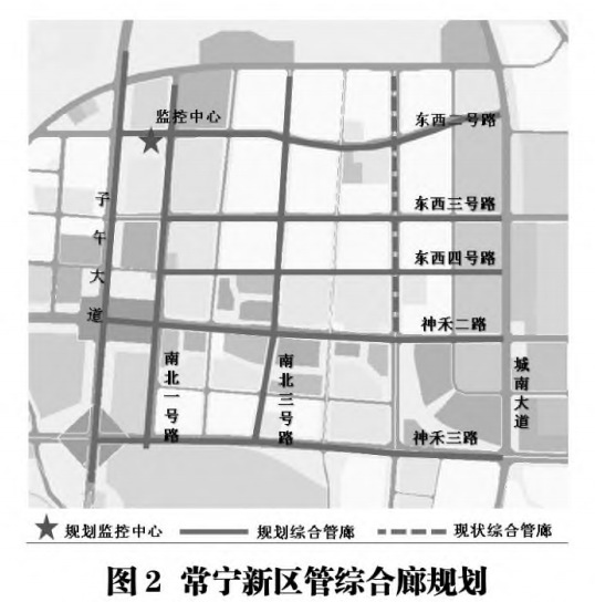 南北三號路綜合管廊為該新區先期 啟動建設的多條管廊之一,該區域管廊規劃密度高,各管廊之間相互連通,成網成片,因此供電電源的選擇應統籌考慮(見圖2)。