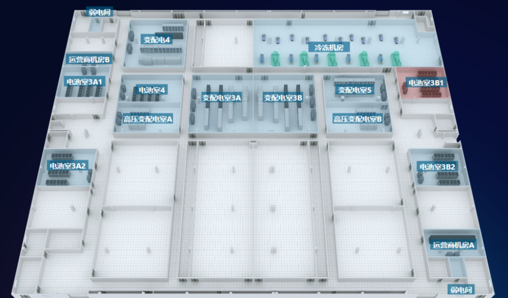 某數據中心建成較早,機房建筑面積約1.5萬㎡,地上兩層,一層設置為變配電室、蓄電池室、冷水機組室、運營商機房等電力和網絡基礎設施,見圖2。二層主要設置12間機房,總共可部署約3000組機柜,已部署1500組。供電系統設置兩臺110kV主變,2個10kV開閉所,4個10/0.4kV低壓變配電室,8臺低壓變壓器,總供電容量2萬KVA,低壓配電室配備有UPS設備以保障供電,末端共70面安科瑞ANDPF精密配電柜為IT設備提供主備電源。