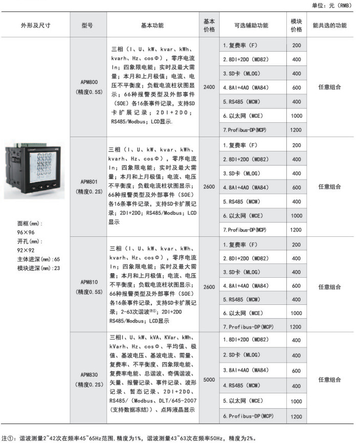 APM系列網(wǎng)絡(luò)電力儀表按IEC標(biāo)準(zhǔn)設(shè)計,具有全電量測量,電能統(tǒng)計,電能質(zhì)量分析及網(wǎng)絡(luò)通訊等功能,主要用于對電網(wǎng)供電質(zhì)量的綜合監(jiān)控診斷及電能管理。該系列儀表采用了模塊化設(shè)計,當(dāng)客戶需要增加開關(guān)量輸入輸出,模擬量輸入輸出,SD卡記錄,以太網(wǎng)通訊時,只需在背部插入對應(yīng)模塊即可。
