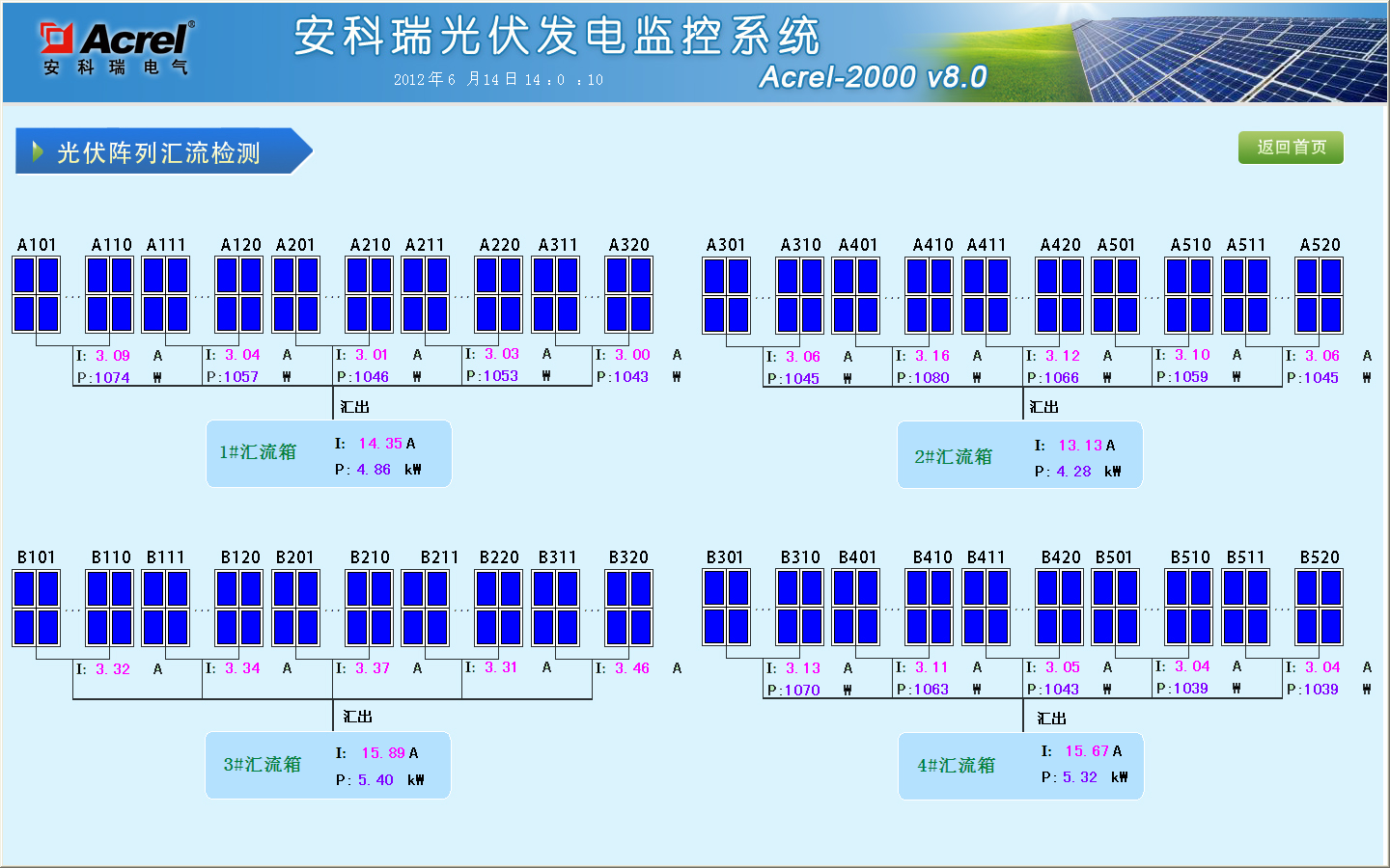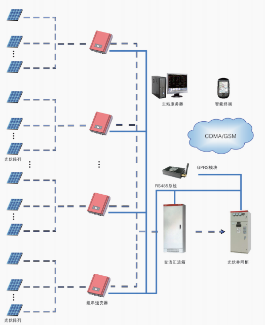 太陽能光伏電站主要由光伏電池陣列、匯流箱、低壓直流柜、逆變柜、交流低壓柜、升壓變壓器等組成,最后產生的交流直接并入電網。針對每個環節電力參數檢測的需要,安科瑞推出了AGF系列光伏匯流采集裝置、ACR10R系列防逆流監控裝置、APQM系列電能質量在線監測裝置、匯流箱及并網柜等產品,分別應用于匯流箱、直流防雷柜及交流柜中,并通過Acrel-2000 V8.0光伏發電監測系統實現后臺集中監控。