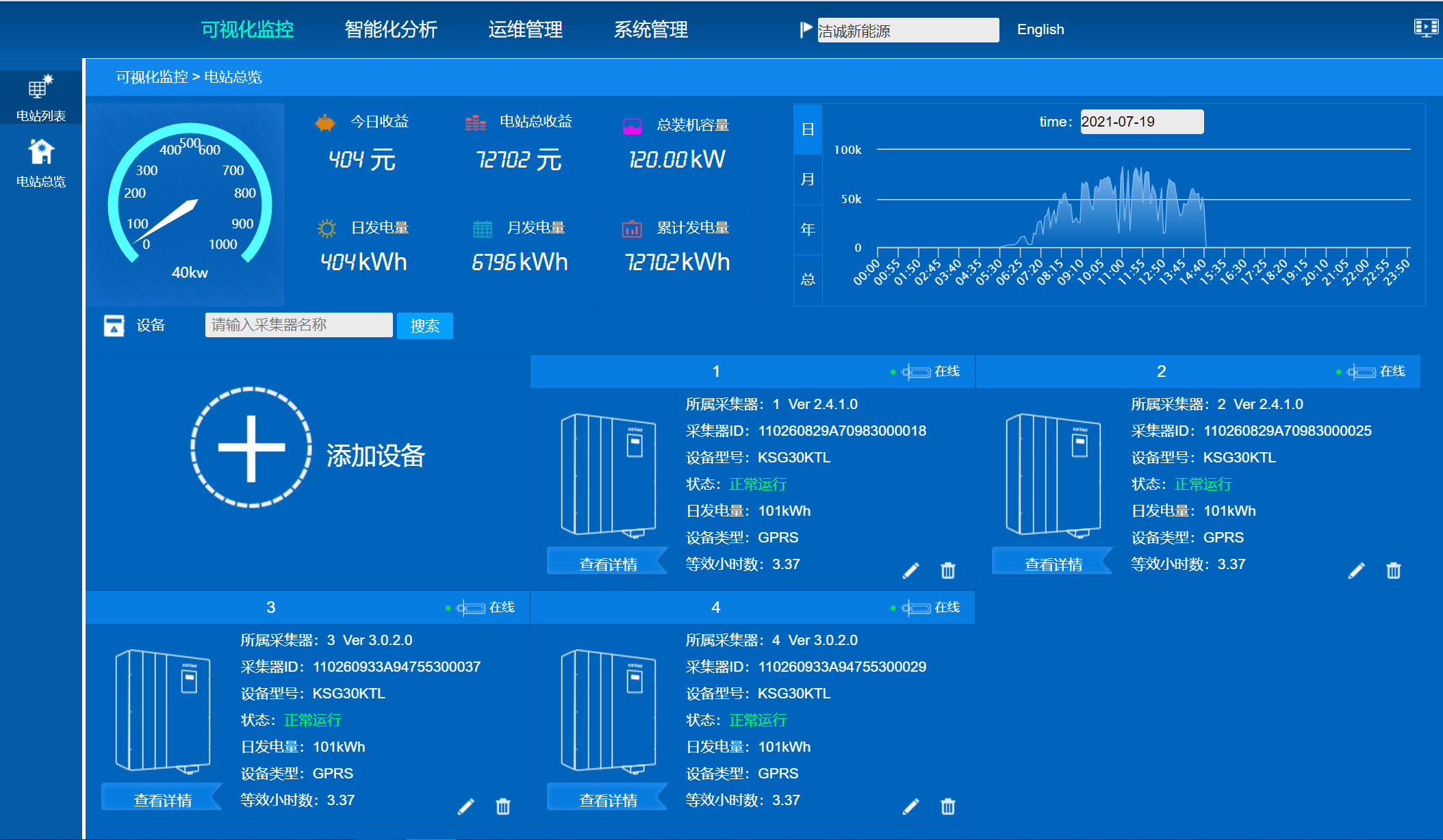 2)顯示單個場站當日發電收益、總收益、裝機容量、日/月/累計發電量以及功率曲線、設備狀況等。