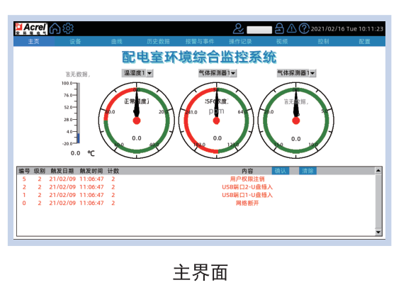 觸摸屏上電進入工作狀態后,默認為主界面,在此界面可觀察到配電室環境溫濕度、SF6氣體和O2濃度等監測信息以及當前事件列表。