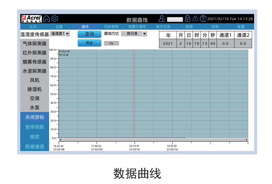 在曲線查詢界面,可以直接查看遙測參量曲線,包括溫度、濕度、水位、有害氣體濃度、電壓、電流等曲線。